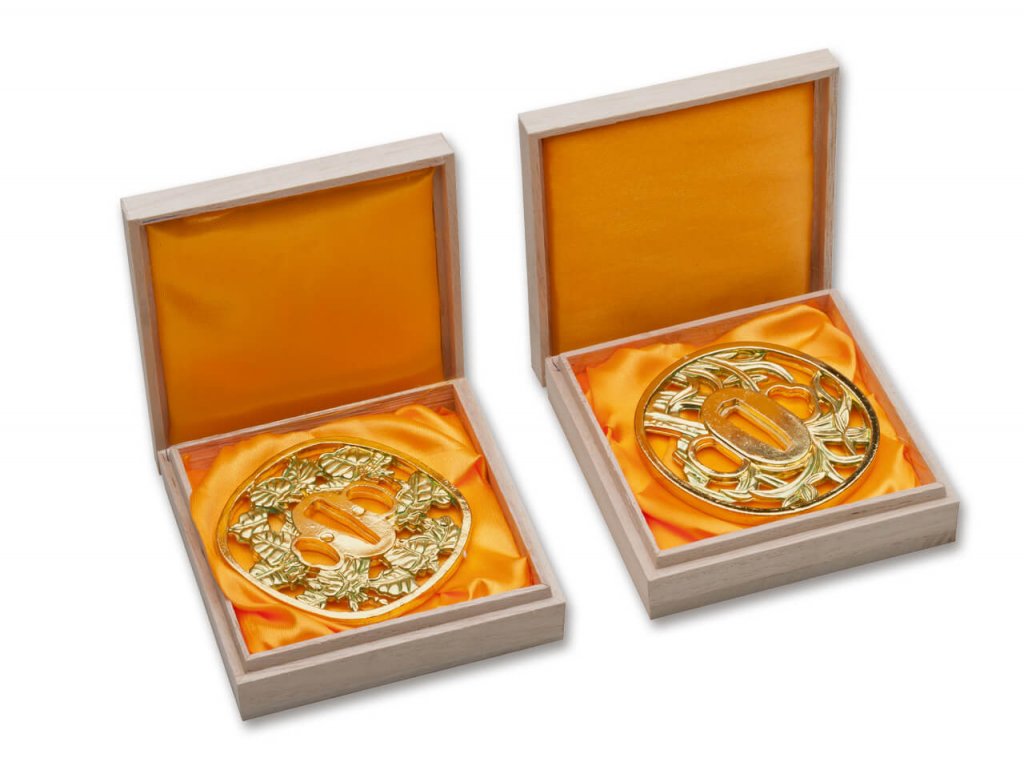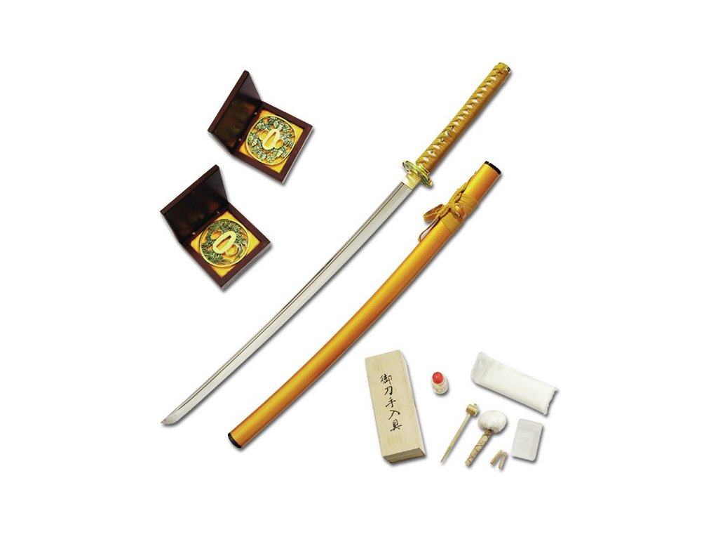 Kování vlastního meče má individuální charakter. Rukojeť je potažena genuing ray kůži pod rafinovaným vinutím. Jemně lakované dřevěné pouzdro odpovídá barvě rukojeti. Meč je dodáván spolu s tradiční dřevěnou krabičkou, která je lemována i s asijskými hadříkem. Chcete-li ušetřit, k hodnotě tohoto meče přikládáme vak na nošení, stejně jako originální čištění. Zlato-barevná rukojeť a pouzdro, vzrušující kontrast k jemně saténové-hotové čepeli z uhlíkové ocele, tsuba steel. K dispozici je možnost volby mezi dvěma různými Tsubami, které jsou dodávány s mečem a lze je snadno změnit.